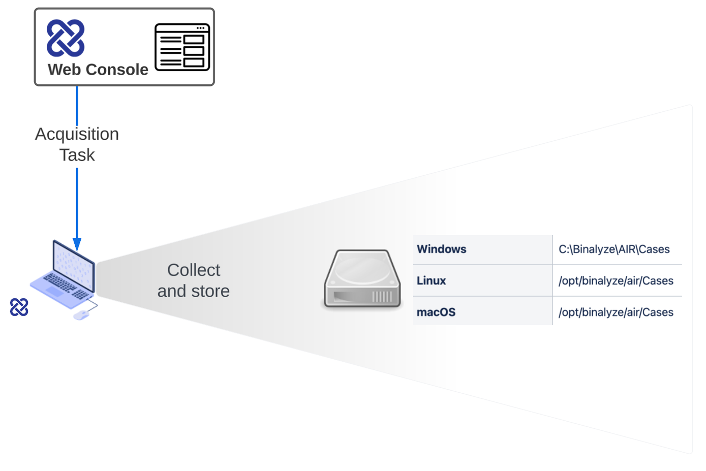 - The AIR responder installed on asset machines runs the Acquire Task on the asset, collecting evidence and artifacts.