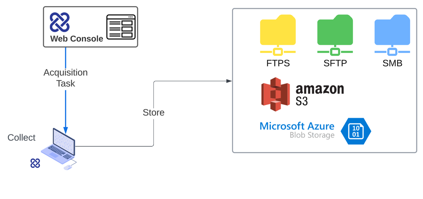 Section titled “Introduction ”AIR provides two separate mechanisms for storing collected evidence, artifacts, and data. The first and default method is to use the local storage of the asset and the server machines’ file system. The second method utilizes remote network services, which we refer to as Evidence Repositories, including SFTP, FTPS, SMB, Amazon S3 Buckets, Azure Blob Storage, and Google Cloud Storage.