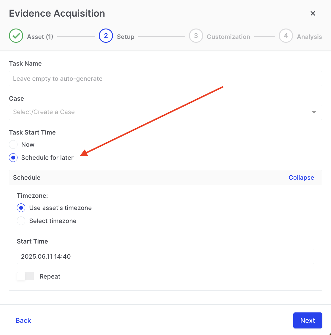 Step 2, the Setup, allows you to edit the Task Name, the Schedule, and even the acquisition profile to be used: