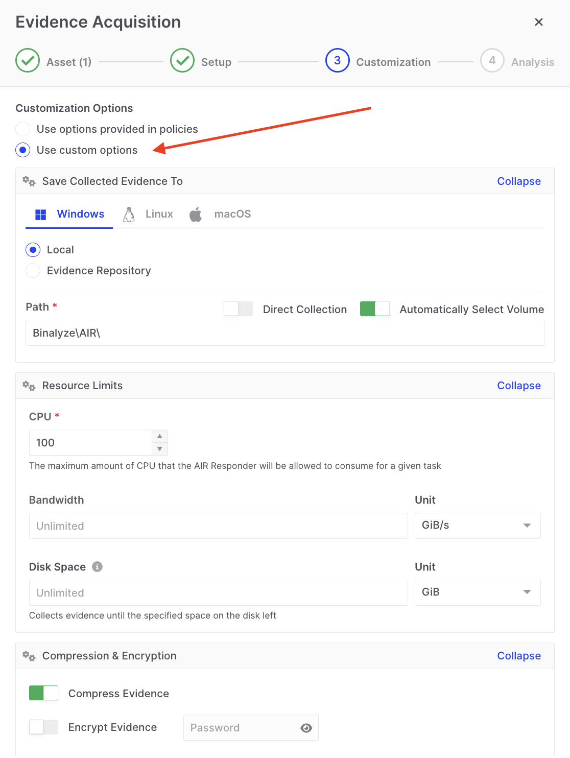 - Enable compression and encryption to be applied to the collected evidence.
