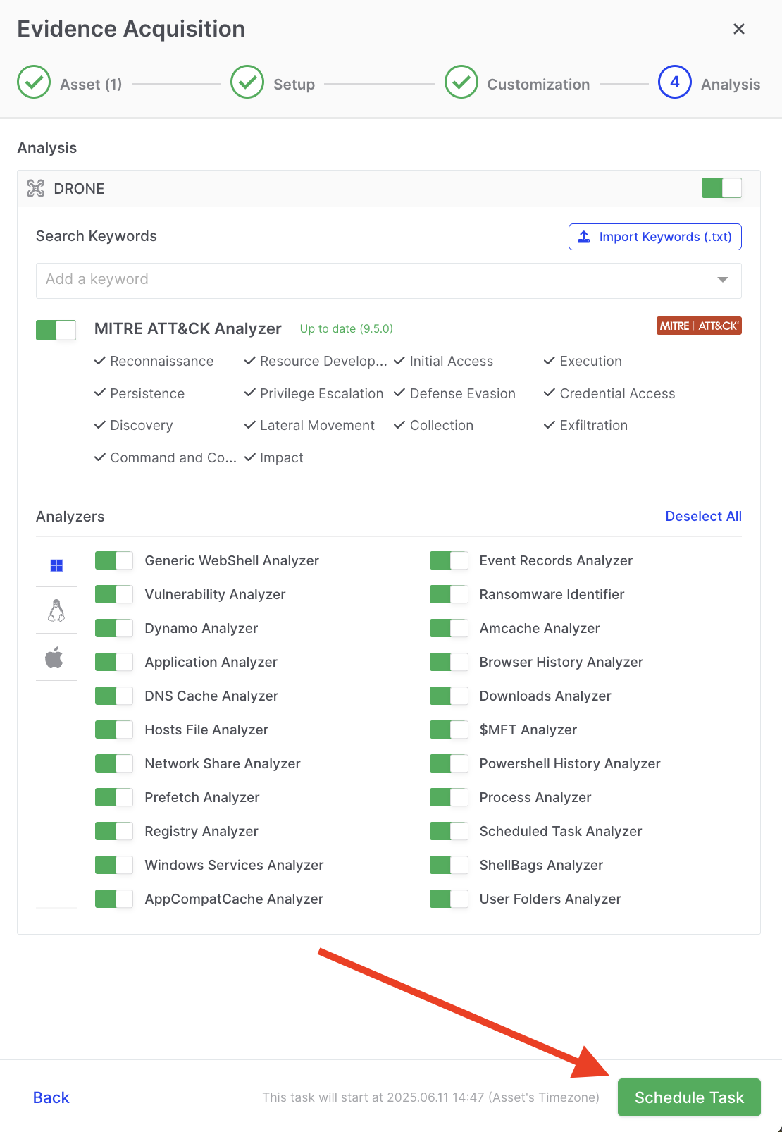 Section titled “Step 4 - Analysis”In this final step, you can enable or disable the DRONE and MITRE ATT&CK Analyzers.