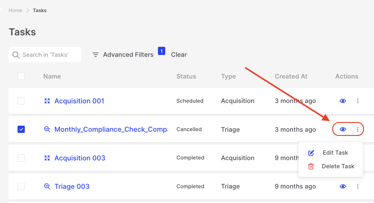 From the filtered results, selecting the ‘eye’ icon presents you with the Task Details and the ellipse with Edit or Delete Task options: