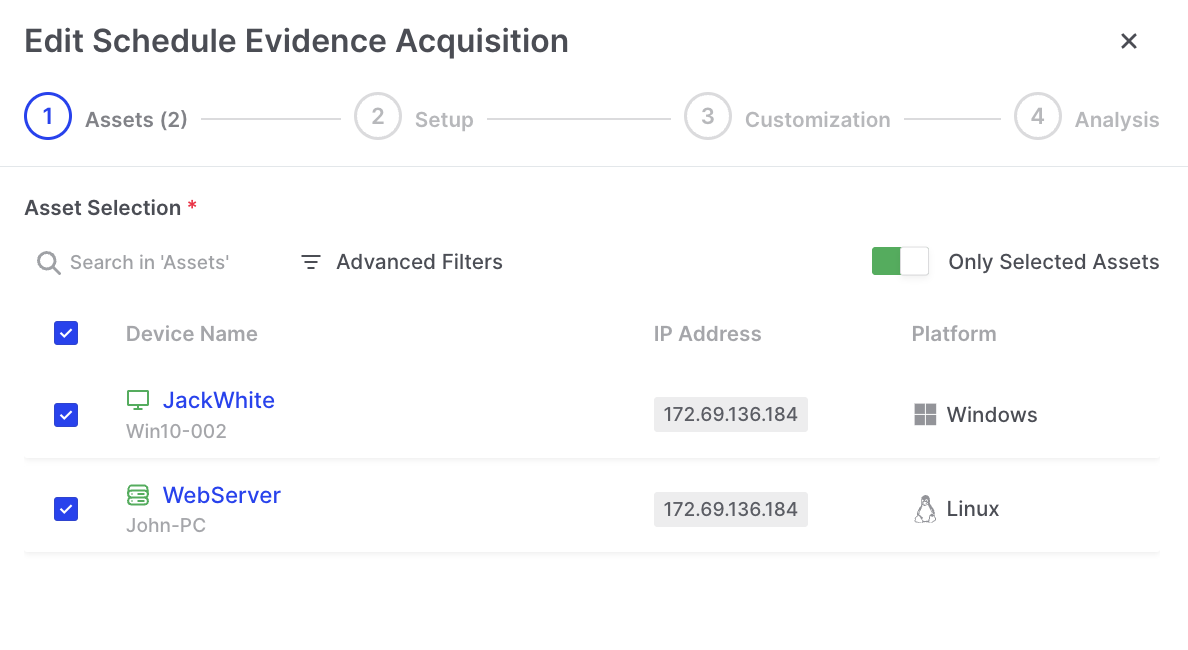The Edit Scheduled Task Wizard will now open, allowing the user to toggle off the “Only Selected Assets” switch (as shown below). This now reveals all other available assets that can be added to the scheduled task: