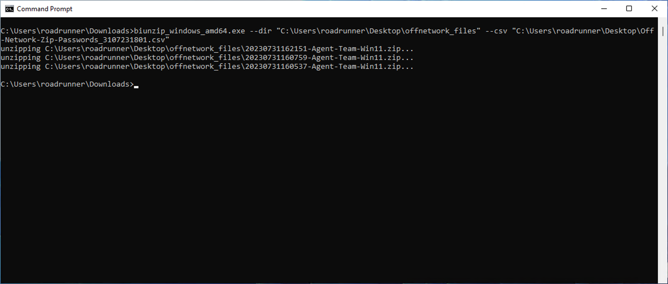 In this example, zip_dir_path points “C:\Users\roadrunner\Desktop\offnetwork_files” directory, csv_file_path points “C:\Users\roadrunner\Desktop\Off-Network-Zip-Passwords_3107231801.csv“ file.