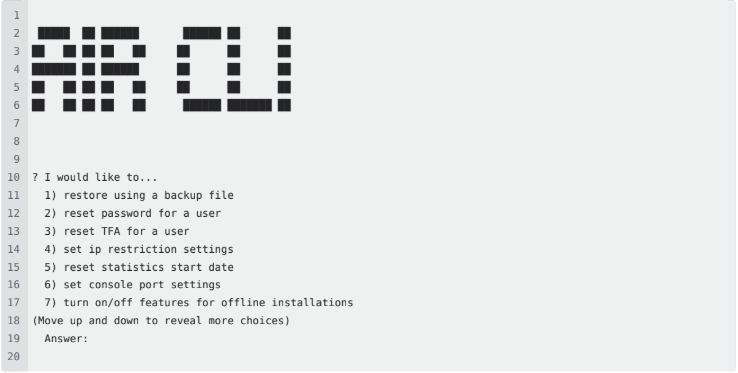 1 ? I would like to... reset statistics start date2 ? Please provide the PostgreSQL URI (Just press "Enter" to use the default) postgresql://air-data:#DBPASSWORD#@air.data-master.server:5432/airdb3 Statistics Start Date is 2025-04-17T18:48:54.688Z.4 Statistics Start Date Reset Successfully completed!6. Enable/Disable Console Port Settings