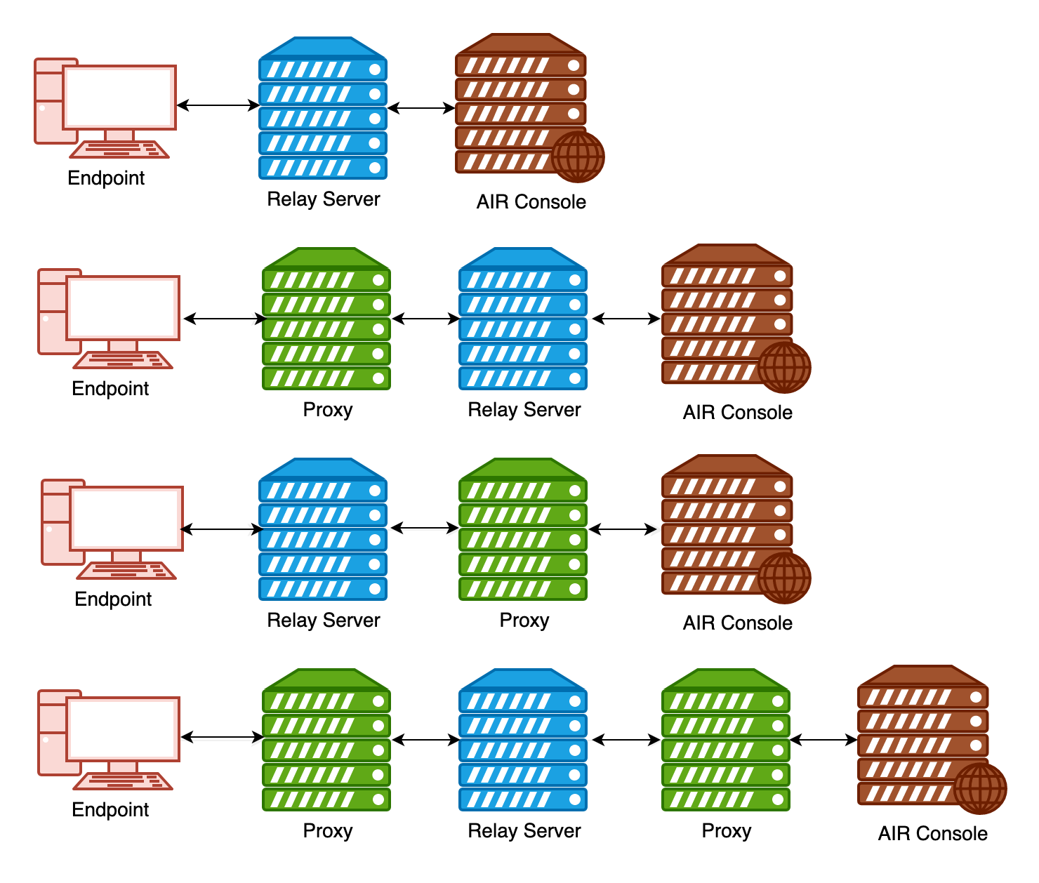 Like the responder, the Relay Server has the capability to proxy connections through a proxy server when communicating with responders or the AIR console. This provides flexibility in terms of configuring proxies for the responder, which connects through a Relay Server, or setting a proxy specifically for the Relay Server. Additionally, it is also possible to set proxies for both the responder and the Relay Server simultaneously. The diagram below illustrates all the possibilities for proxying the Relay Server and the responder.