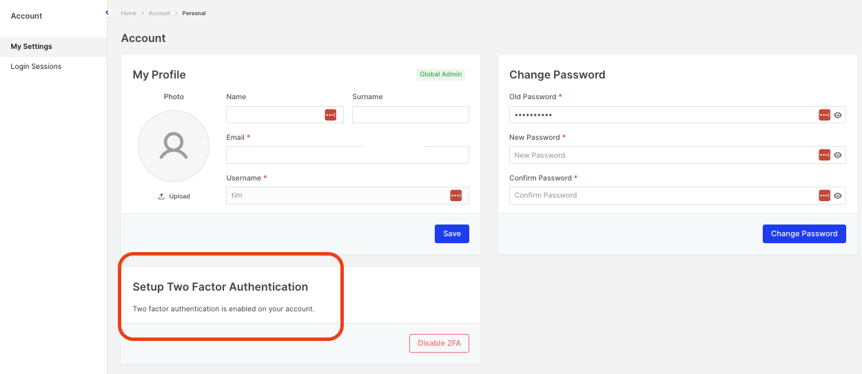 • Individual 2FA Setup and Reset: Users can enable two-factor authentication (2FA) independently in ‘Account > Setup Two Factor Authentication’. Global Admin and users with the “user update” privilege can reset 2FA.